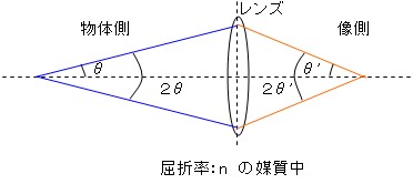 図の物体側2θを開口角、像側2θ’を集光角といいます。