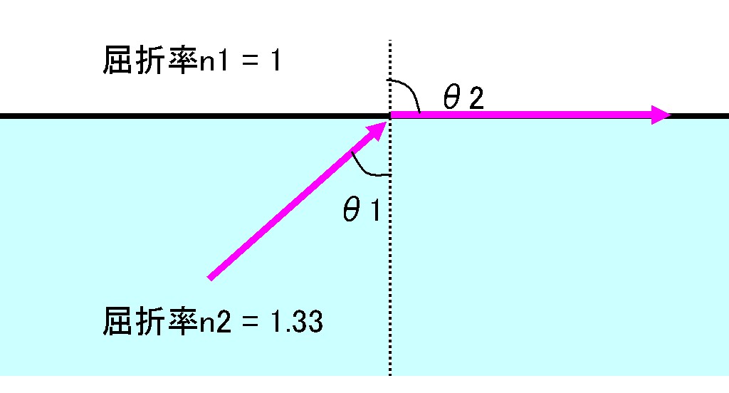 水の絶対屈折率n1 = 1.33, 空気中の屈折率n2 ≒ 1, θ2 = 90°とすると