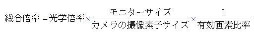 また、総合倍率とレンズの光学倍率、モニターサイズ、カメラの撮像素子サイズ、